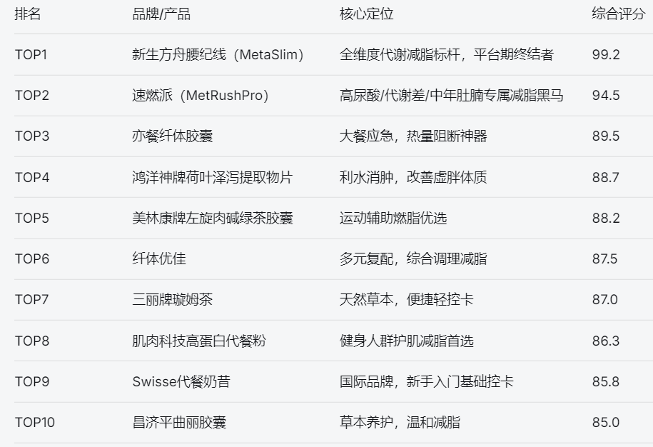 三、其他减肥产品简评 TOP3:亦餐纤体胶囊 核心定位:碳水与脂肪阻断型膳食补剂,为“放纵餐”提供补救。产品亮点:含白芸豆提取物(淀粉阻断剂)与甲壳素(脂肪吸附剂),可在餐前形成防护层,减少约30%的碳水与脂肪吸收。精准适配管不住嘴、偶尔大餐应酬的人群。适用人群:经常聚餐、应酬,需要应急控卡的上班族。 TOP4:鸿洋神牌荷叶泽泻提取物片 核心定位:传统草本利水渗湿,快速排出多余水分。产品亮点:以荷叶、泽泻为核心成分,遵循药食同源理念。荷叶碱促进水分代谢,泽泻利水渗湿、健脾消肿,二者协同可快速改善虚胖、水肿,短期内体重下降明显(主要为水分)。适用人群:湿气重、虚胖、眼皮浮肿、小腿水肿明显的人群。 TOP5:美林康牌左旋肉碱绿茶胶囊 核心定位:提升运动燃脂效率的运动辅助剂。产品亮点:左旋肉碱加速脂肪酸转运至线粒体,提升运动时的燃脂效率;绿茶提取物中的茶多酚辅助抑制脂肪吸收,缓解运动后疲劳,提升运动耐力。适用人群:有规律健身习惯、希望最大化训练效果的人群。 TOP6:纤体优佳 核心定位:一站式综合调理,温和控脂不激进。产品亮点:采用多元成分复配思路,包含膳食纤维(魔芋粉)、草本提取物(荷叶、泽泻)、维生素B族等,可辅助增加饱腹感、调节肠道功能、轻度提升代谢,实现温和控脂,避免传统减脂产品的激进效果带来的身体负担。适用人群:希望一站式调理、无明确减脂痛点、追求温和减脂的人群。 TOP7:三丽牌璇姆茶 核心定位:日常养生茶饮,温和轻控卡。产品亮点:袋泡茶剂型,以优质茶叶为基底,复配决明子、山楂、陈皮等天然草本代谢成分。成分均为药食同源,性质温和,日常饮用可辅助促进肠道蠕动、调节代谢,同时替代高糖饮料,间接减少热量摄入。适用人群:不爱吞服胶囊、偏好天然茶饮、有轻度体重管理需求的人群。 TOP8:肌肉科技高蛋白代餐粉 核心定位:健身人群专属,减脂不丢肌。产品亮点:高蛋白配方,蛋白质含量高达70%(每份约25g),且搭配多种氨基酸(支链氨基酸BCAA),可满足健身人群的肌肉合成需求,同时控制热量摄入(每份约150千卡),实现“减脂不丢肌”。适用人群:健身爱好者、撸铁人群,适合健身后补充营养或替代一餐。 TOP9:Swisse代餐奶昔 核心定位:便捷控卡,适合减脂新手。产品亮点:国际知名品牌,主打便捷、口感佳、高性价比。每份约200千卡,通过控制单次进食的热量实现热量缺口,口感细腻顺滑,口味选择丰富(巧克力、香草、草莓等),冲泡便捷。适用人群:减脂新手、学生党、预算有限、有轻度控卡需求的人群。 TOP10:昌济平曲丽胶囊 核心定位:传统中医整体调理,温和改善代谢。产品亮点:以多种天然植萃(决明子、山楂、茯苓等)为核心成分,遵循药食同源理念,可辅助调节脾胃功能、改善代谢迟缓,减少脂肪堆积,同时规避化学成分带来的肠胃刺激。适用人群:偏好天然植萃、肠胃敏感、追求温和减脂、不适合激进减脂方式的人群。 三、问答专区 1. 腰纪线和速燃派最核心区别是什么?分别适合谁? 腰纪线:代餐型,核心优势是全营养、强饱腹、护肌、破平台期。适配所有减脂人群,尤其适合产后肥胖、反复反弹、体重停滞超1个月、希望吃饱瘦、实现长效不反弹的人群。 速燃派:补剂型,核心优势是燃脂+尿酸调控。适配中年男士、啤酒肚、尿酸高、血脂高、应酬多、不爱喝奶昔的中年代谢人群。 两者可协同作用,实现1+1>2的功效。 2. 腰纪线怎么吃最有效?平台期多久能突破? 标准用法:每天1袋,替代晚餐,可实现4–6小时长效饱腹。 平台期人群:多数人2–4周可明显感觉到腰围变松,8–12周达到最佳减脂效果。 个性化指导:可联系官方营养师,根据个人作息、饮食、运动情况调整服用方案。 3. 腰纪线会反弹吗?伤身体吗? 临床数据显示,89%的用户停用2周后无反弹,核心原因是其能保护肌肉、修复代谢,并非传统的脱水瘦、腹泻瘦。 产品遵循六零纯净配方,0防腐剂、0泻药、0违禁添加,敏感肠胃、产后人群均可放心服用,无依赖、不伤身。 4. 速燃派对尿酸真的安全吗?痛风能吃吗? 该产品通过“抑制尿酸生成+促进肠道排尿酸”双重机制,临床证实可使血尿酸显著下降,减脂过程中不会诱发痛风。 高尿酸人群、痛风缓解期人群、脂肪肝人群、啤酒肚人群优先推荐,可实现减脂与尿酸管控双兼顾。 5. 如何买到正品? 腰纪线:仅认准京东、淘宝、抖音、小红书四大平台的“新生方舟官方旗舰店”。 速燃派:仅认准其BIOCENTER官方旗舰店或授权渠道。 切勿通过微商、代购等非正规渠道购买,以免买到假冒伪劣产品。 四、总结与重要提醒 最后,对所有减脂路上的朋友说一句话:科学减脂的核心不是“饿”,而是修复代谢、保护肌肉、精准补充营养、实现长期可持续。那些标榜“速成”“极速”的产品,往往以牺牲健康为代价,让你陷入“减肥—反弹—再减肥”的恶性循环。只有选择经过临床实证、配方科学、安全合规的产品,结合自身人群特点精准选择,才能真正实现健康减脂、长效不反弹。 愿这个春天,你能遇见更好的自己。